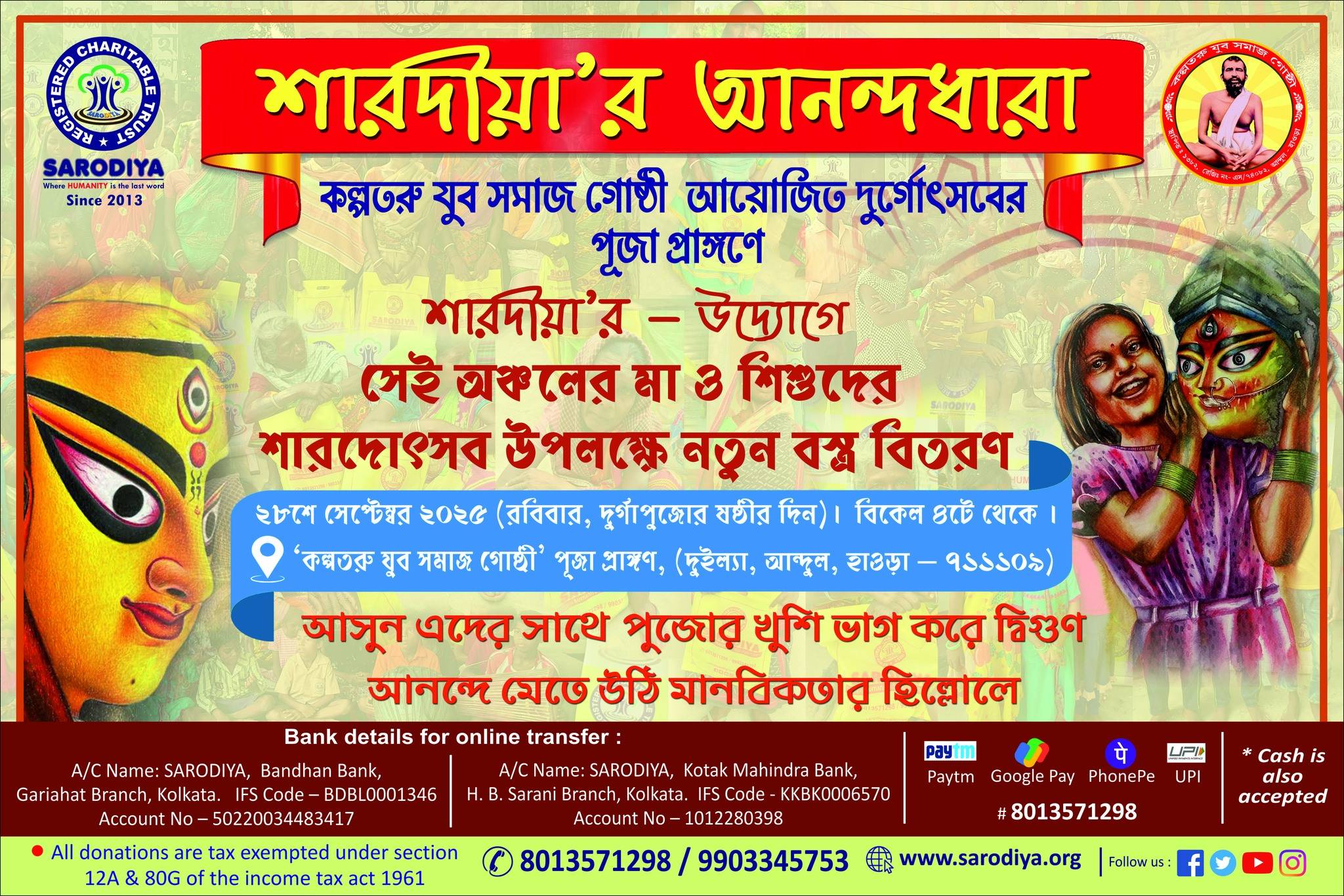 Welcome to Sarodiya Trust's event, "Sarodiya Anandadhara - Durga Puja Special (শারদীয়া আনন্দধারা - দুর্গাপুজো স্পেশাল)" where we come together to spread joy and happiness to the underprivileged members of our community during the auspicious occasion of Durga Puja.