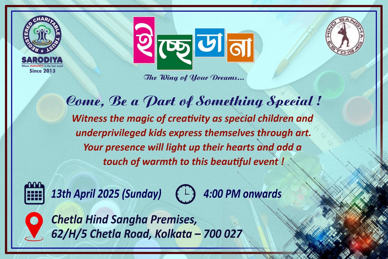 A Special Art Workshop has been organized on 13th April 2025 (Sunday) from 4:00 PM at the Rasbehari Hind Sangha Premises. This remarkable event will bring together special children and underprivileged children from the community to showcase their creativity through art. We warmly invite you to join us in celebrating the power of imagination and self-expression. Your presence will add warmth, joy, and inspiration, making this gathering even more meaningful for these young hearts.
